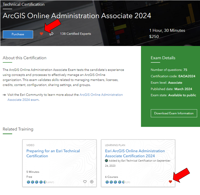 Once you’ve selected an exam from our list in Esri Academy, click on the exam card to open the exam details page. On this page, you can click the heart icon below the title of the exam as well as the hearts at the bottom of each resource under “Related Training” to add them to your Wish List.