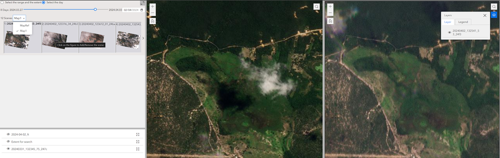 The figure shows two maps and there is a Select Widget (custom widget), in which we can select the map (MapRef or Map1) to add the desired images (cliking in the satellite picture inside ScrollList).