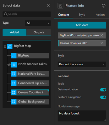 Depending on how your user searches and in what order, the Counties Near Me Widget may fall out of sync with the currently searched for Bigfeet. So you will definitely want to hide it. And I still ain't a fan of how Near Me looks so I'll hide both of them. To make my output, I will use the newly updated capabilities of the Feature Info Widget. To get my Bigfeet, I will go to the Outputs Tab>Bigfeet Near Me>BigFoot (Proximity) Output View.