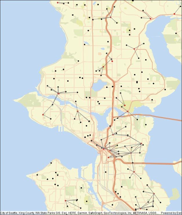 We can also look at the results as a map to see the distribution of schools (black) and libraries (red), with connecting lines showing the closest to each school. We can do this in GeoAnalytics Engine using the results from our Nearest Neighbors calculation. Since each result row in the table has the geometry from each input (Schools & Libraries), we can simply connect the points for each using the ST_ShortestLine function: