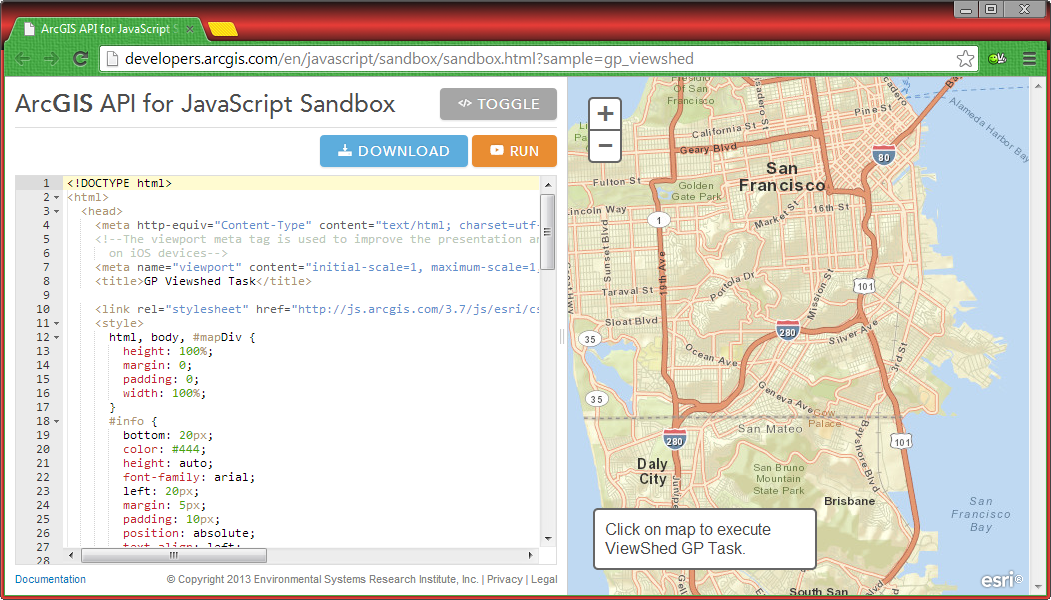 Auf der Webseite zu diesem Beispiel gibt es eine Beschreibung, was in der Anwendung mit dem jetzigen Code passiert: Beim Klick auf die Karte wird mit einem von Esri zur Verfügung gestellten Geoprocessing-Dienstes berechnet, welche Bereiche bei einer Sichtweite von 5 Meilen vom geklickten Punkt aus zu sehen sind. Dabei befindet sich die Kartenmitte beim Laden des Dokuments in Kalifornien und die Hintergrundkarte ist eine Straßenkarte.