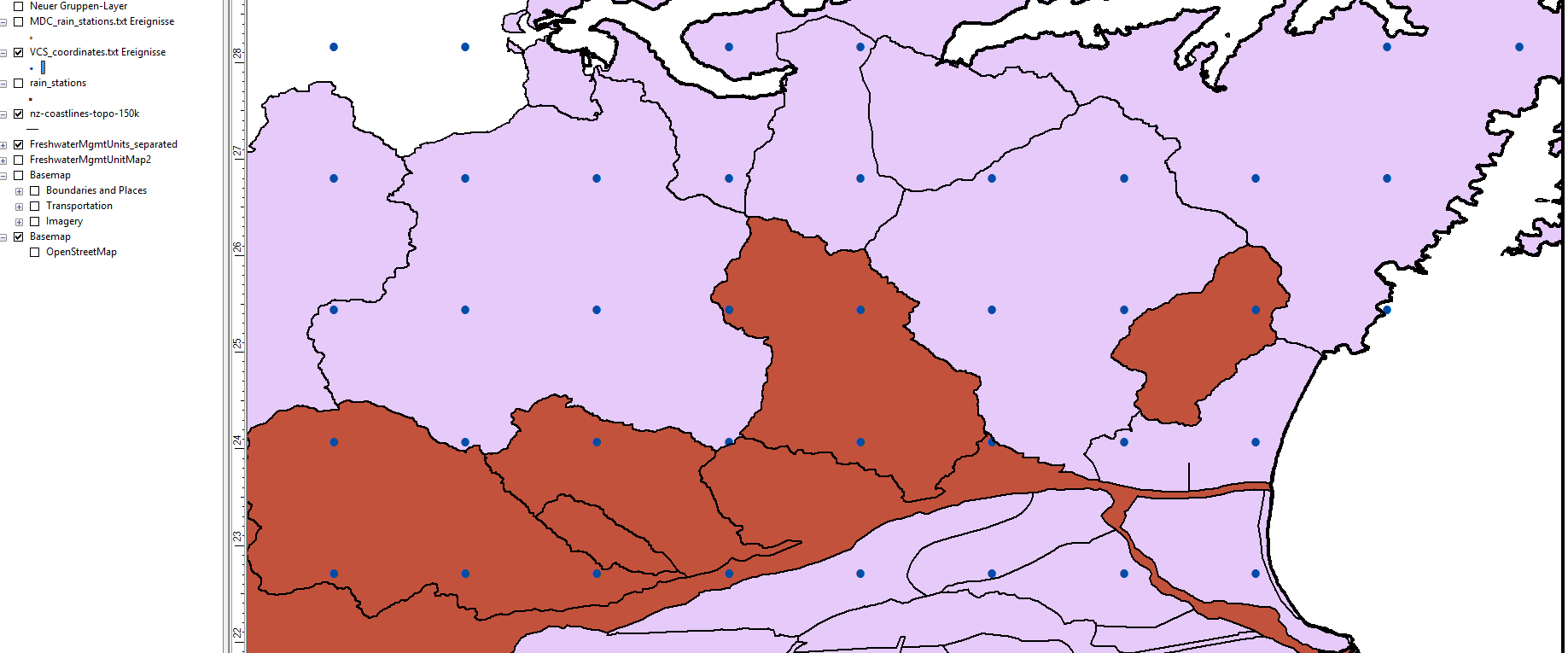 In the picture above you can see the climate stations (blue dots) and the river catchment outlines, the important cathcments being brown.
