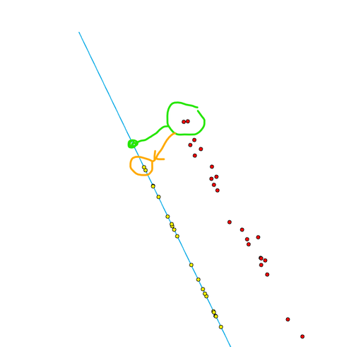 Now my question is, why the green circled points aren't where I drew the green point (that should be the closest points-river distance) but are instead where I drew the orange line?