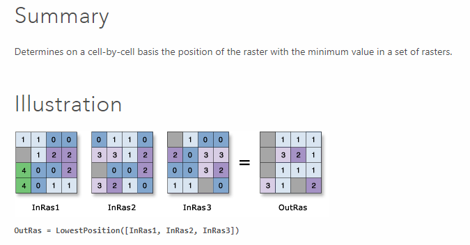 LowestPosition is to enable on to examine data which may have a sequential nature. For instance, data collected over time. The example that is used represents 3 separate rasters collected at different times for some attribute. If you are interested in "when" something happened you would use