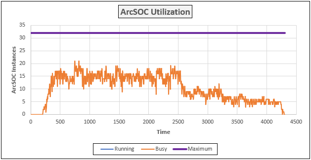 Note: The Maximum and Running represent the ArcSOC service configuration instance maximum and minimum, respectively. In this case, Running has the same values and is plotted “behind” Maximum. Busy represents the number of instances that were active (due to requests from users) across all the machines in the Site.