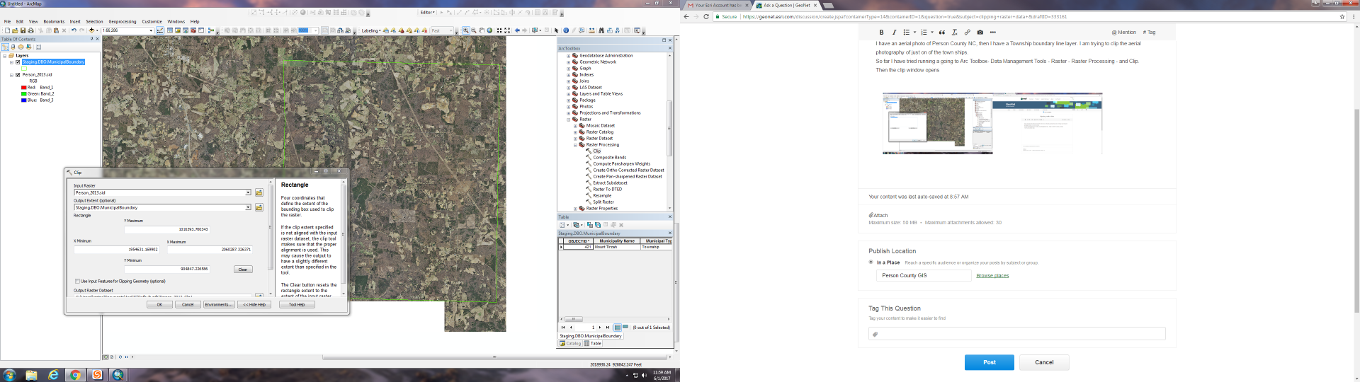 I have an aerial photo of Person County NC, then I have a Township boundary line layer. I am trying to clip the aerial photography of just on of the town ships.
