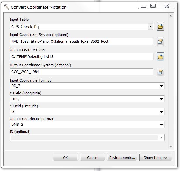 I need to calc degrees minutes seconds formats for latitude & longitude coordinates in a point feature class projected as NAD83 state plane Oklahoma, south, Feet. I received a very helpful answer from Neil Ayres, earlier this week, to my query on how to use the data frame GCS North American 1983 and calc geometry to calc the coordinates for a feature class projected as NAD83 State Plane Oklahoma, feet. Unfortunately, since the decimal degrees option is greyed out for the data frame that is the format the calc geometry tool calcs. How can I calc or change decimal degrees lats and longs to deg min sec format. I've tried, unsuccessfully, doing project to change the fc projection to another that would allow a change to the desired format.