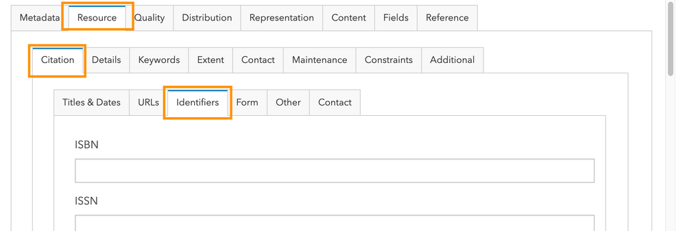 A Metadata Identifier uniquely identifies the metadata record associated with the resource. ArcGIS automatically provides the Metadata Identifier to uniquely identify the metadata record associated with the resource.