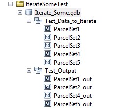 As an example, in this case the Model is set up to copy 5 feature classes from one Feature Dataset to another as long as the feature class contains at least one record. So in this example, ParcelSet3 has no records (I deleted them all before running this), so was not copied.