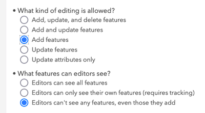 We have a service that is updated via a Survey123 form with attachments enabled. For security, the original Hosted Feature Layer that is updated by the survey has these editing settings: