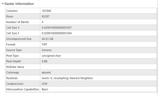 Recently I published another orthomosaic for a somewhat larger area with even high resolution. The orthomosaic tiff file was about 20 GB (44 GB uncompressed), and this is what its tile cache looks like (somewhere between 2 & 3 GB):