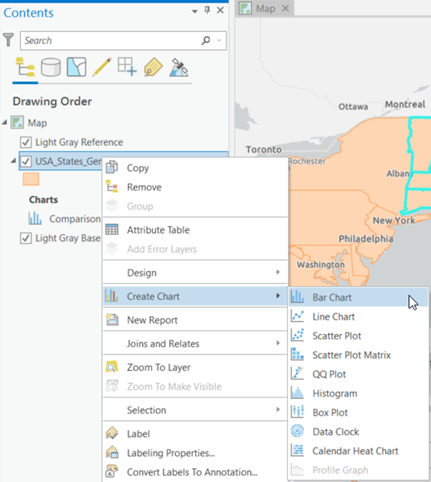 5. We are interested in the population of US states, so let's also open a chart. Context-click the USA_States_Generalized layer in contents and choose Create Chart > Bar Chart.