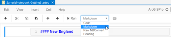 9. Select Markdown from the dropdown list above the cell, and then press shift+enter on the keyboard to run the current cell and simultaneously create a new cell below (or select the next cell).