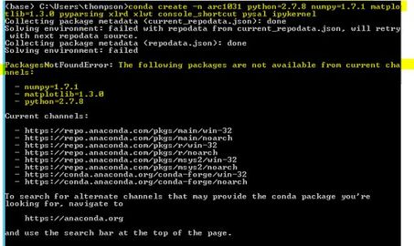 When I implement the step in the procedure "Create an Anaconda environment for use with ArcGIS," and paste the prompt relevant to ArcMap 10.3.1, I receive the following message from the Anaconda prompt stating that none of the packages can be found: