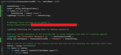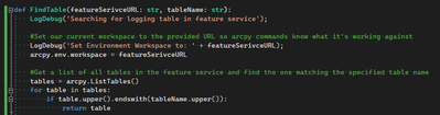 esriJobMessageTypeError: Traceback (most recent call last): File "E:\arcgis\arcgisserver\directories\arcgissystem\arcgisinput\InformationFromSAMS.GPServer\extracted\p20\geoprocessors\Common.py", line 62, in LogMessageInDatabase integrationLoggingTable = FindTable(IntegrationFeatureServiceURL, "IntegrationLogging"); File "E:\arcgis\arcgisserver\directories\arcgissystem\arcgisinput\InformationFromSAMS.GPServer\extracted\p20\geoprocessors\Common.py", line 93, in FindTable for table in tables: TypeError: 'NoneType' object is not iterable