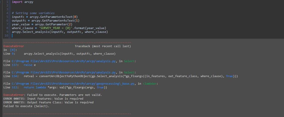 arcpy.Select_analysis(inputfc, outputfc, where_clause)I get an execute error and it says that my parameters are not valid. I am not sure what is wrong--I am also newish to ArcPy which is why I am struggling with this one.