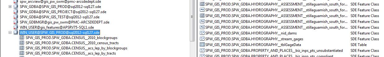 The other connection (view only) would appear as WIN_USER@SPW_GIS_PROD@sql2012-sql127.sde: