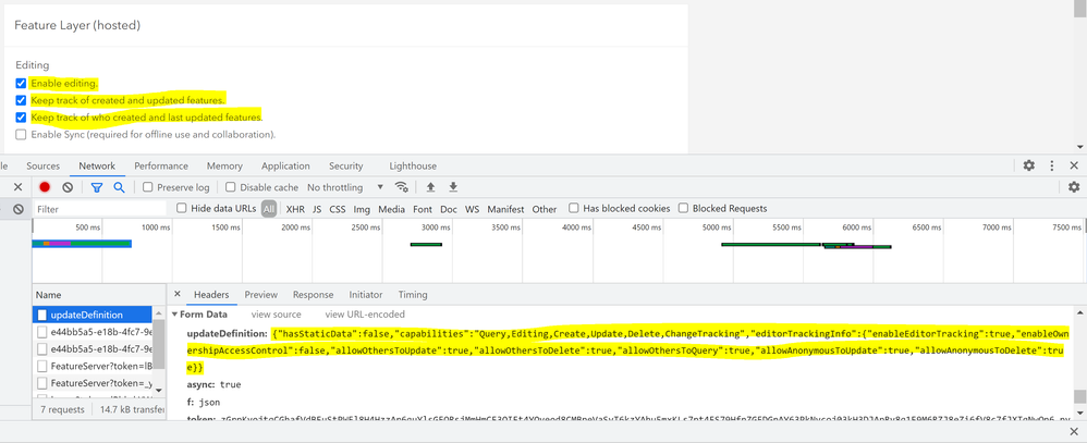 This time, I am trying to enable editing and editor tracking on a hosted feature service. I started by opening up the Chrome developer tools Network monitor, then on the Feature Layer settings page I manually checked the options 'Enable editing', 'Keep track of created and updated features' and 'Keep track of who created and last updated features', then hit Save. I then saw the console send an update_definition request.