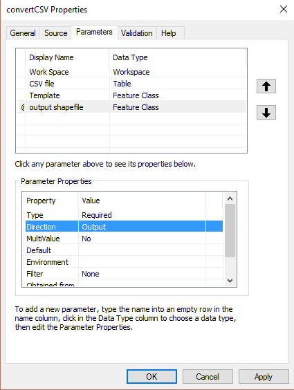 # the path to workplace arcpy.env.workspace = sys.argv[1] # The path to the CSV file inputCSVfile = sys.argv[2] #Get the template shapefile templateShapeFile = sys.argv[3] # The name of the output shape file outputShape = sys.argv[4] <<<-------------------------------------------------- Here???? it doesn't work,Why??? # open CSV file inFile = open(inputCSVfile, "r") # create feature class arcpy.CreateFeatureclass_management(arcpy.env.workspace, outputShape, "POINT", templateShapeFile, "DISABLED", "DISABLED", templateShapeFile)