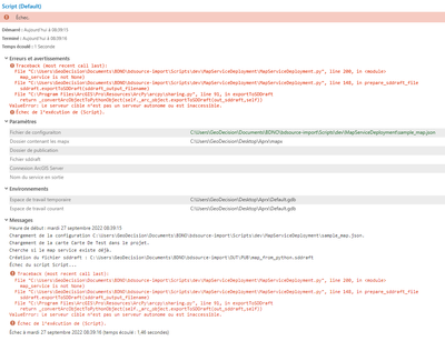 3. It looks like the issue is with the server connection parameter (If I am reading the French right?). I would test my server connection with ArcCatalog. You should be able to navigate to it and open it with ArcCatalog.