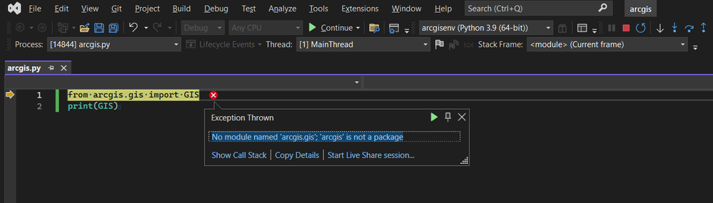 3, but the same codes does not work in visual studio 2022, saying No module named 'arcgis.gis'; 'arcgis' is not a package