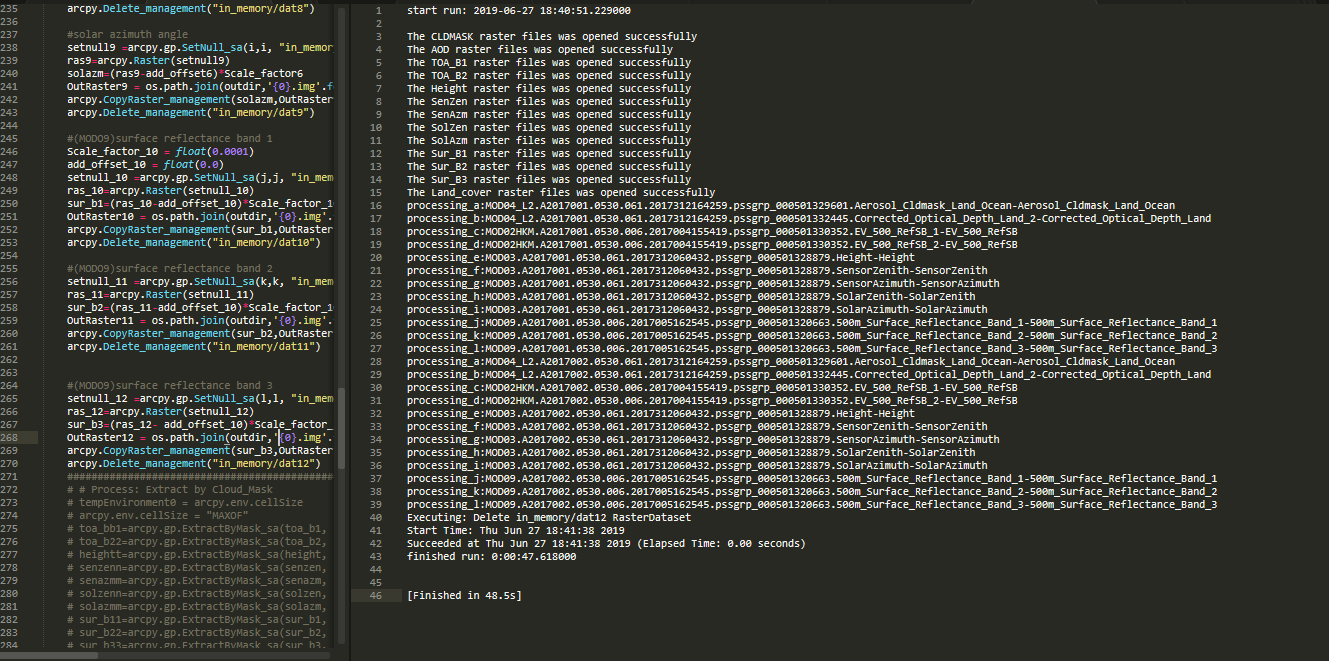 for a,b,c,d,e,f,g,h,i,j,k,l in zip (CLDMASK,AOD,TOA_B1,TOA_B2,Height,SenZen,SenAzm,SolZen,SolAzm,Sur_B1,Sur_B2,Sur_B3):