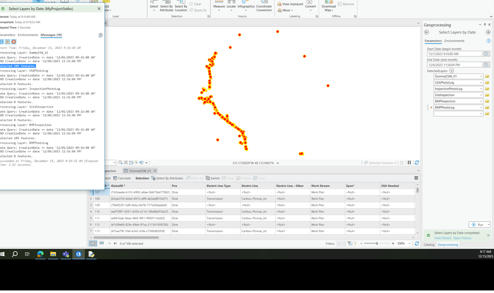 When I run the script on a test copy of the data (same schema as real data I will eventually use), the script has print statements that indicate some records were selected and they are the ones I would expect. However, that selection is not applied in the map. When I open the table, it shows 0 records selected. I do not understand why this is. This is important because the next step of the script will be to use only those selected records within the give range to do a select by location process. Any clue as to why the selection is not applied in the map but does show up in print statements as having happened (see screenshots)? I want the next step to be: take only the selected records in the six S123 layers, and select by location all records within 50ft of those that intersect another feature class. The Script and Screenshots are provided below.