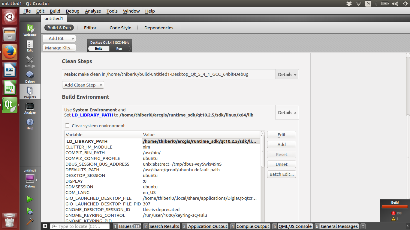 1) In Qt Creator, go to your Projects tab on the left side, scroll down to Build Environment, and click Add to add a new environment variable for LD_LIBRARY_PATH=/<path_to_ArcGIS_SDK>/x64/lib.