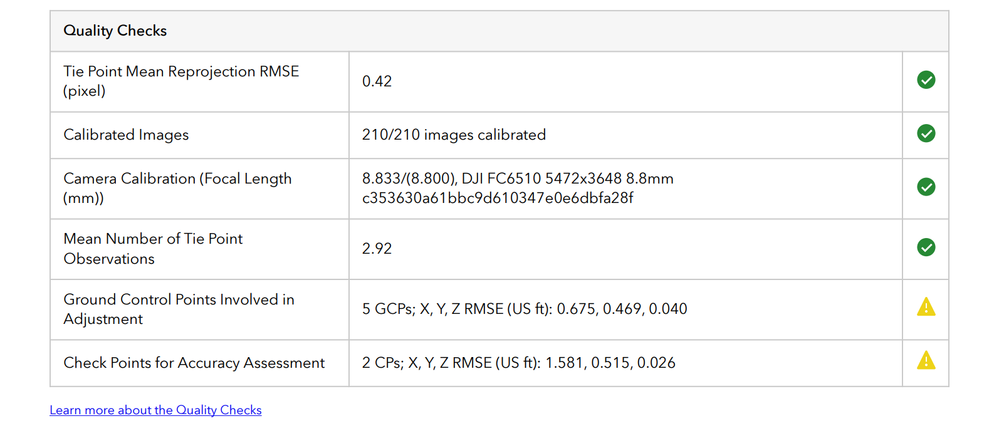 The Quality Checks section, originally introduced in the prior report version, provides an at-a-glance assessment of the data processing. It includes key statistics that can highlight possible issues with the data capture, camera calibration, and GCPs. View detailed explanations and quality indicator thresholds in the documentation (link is also available directly on the report).