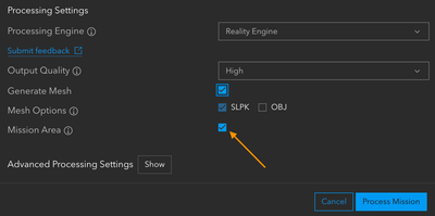 If your project contains corridor scans, vertical scans, and inspection missions that were created manually (not flown with ArcGIS Flight), the mission area feature is not enabled. Due to the unique nature of the image distributions and coverage area for these missions, the Photos mission area might not always be an accurate representation of the photo coverage area. By not adding the constraints of a mission area, it allows the Reality Engine to generate the outputs based on where results can be properly adjusted and reconstructed.