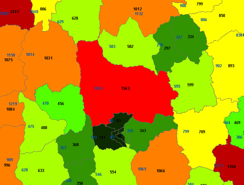 • Calculate the fraction of points by dividing the number of points in each polygon by the number of overlapping polygons at that location