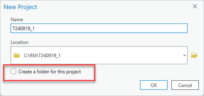 2. Cut down the name (length) of your folders and get rid of the “spaces” in the folder names (between the “C:\RM\ES_Slow the Flow…”).  How about parent folder like “C:\RM\AHTests\T240917_1” that will generate gdb “C:\RM\AHTests\T240917_1\T240917_1.gdb).  When creating the new Pro project, make sure you check off “Create a folder for this project” (lower left corner of the New Project form) otherwise it will generate another subfolder with the same name as the project name and that might not be necessary.