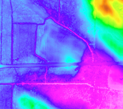 The second image below is a portion of our County  DEM with this setting. The third image is a zoom in on what looks flat. The color ramp adjusts for the the data in that view revealing more detail.
