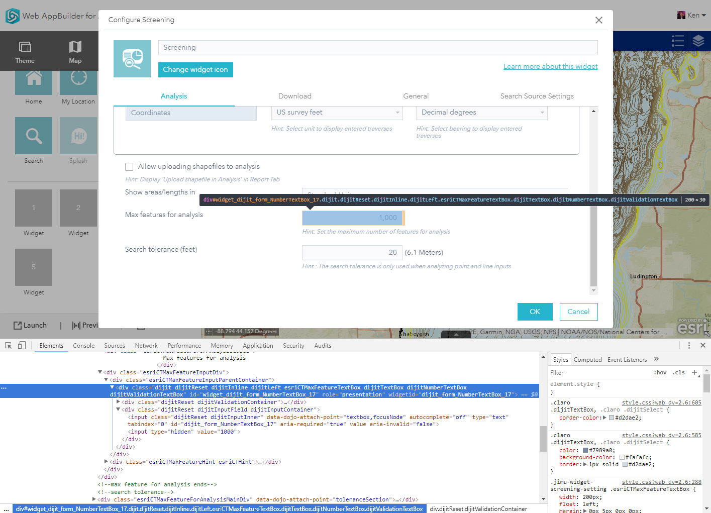 I'm building a Settings dialog, using the Screening Settings dialog as a guide. However, some of the CSS rules for the dijits are not getting applied in my version. Here's an example of a NumberTextBox and the css rules getting applied to it from the Screening Settings.