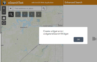 Downloaded new eSearch.zip. I tried a couple of times with WAB-2.20 and once with WAB-2.18 by wiping out the entire folder structure and am still getting the same error when I click on the eSearch icon. I can get to the eSearch config screen without issue. Not sure what is going on. Suggestions? Thanks.