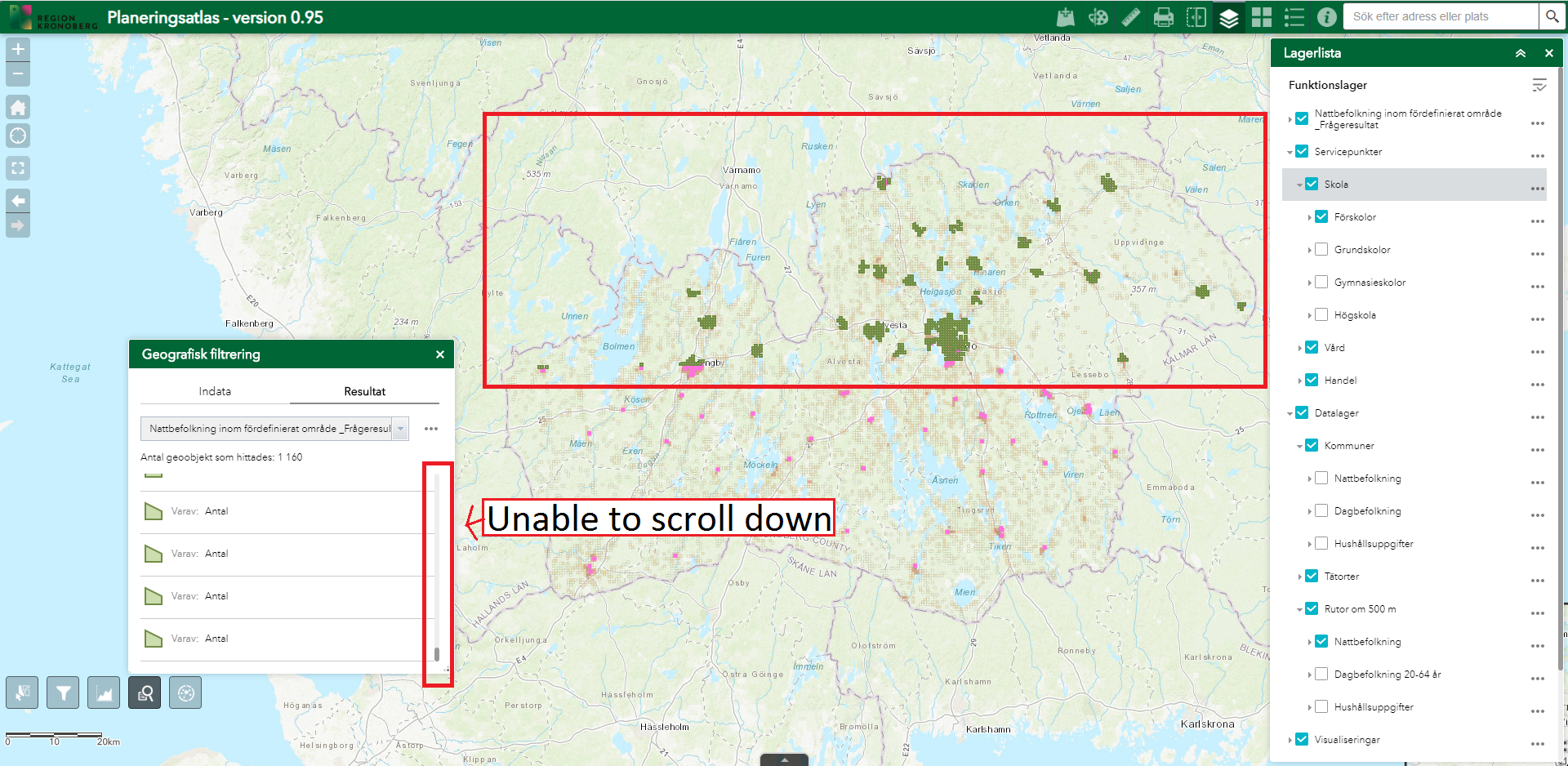 we are experiencing a problem with the geographic filter availible in the query widget. We use the widget in order to select features from a grid with population data (the grid contains approximatley 5 000 polygons). In the query widget, when a large number of polygons are selected by one or a few selectors, it is necessary to scroll down in the results if the tool is to select all the squares. However, when the number of selectors increase the widget is unable to select the features that it should. See attached images.
